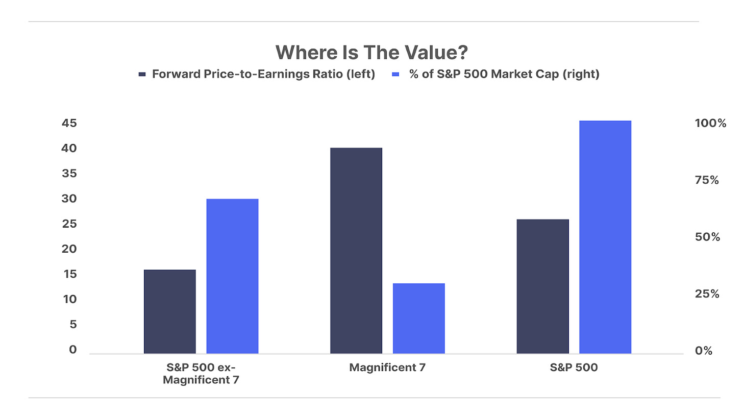 Right now, the Magnificent 7 account for 33% of the S&P 500 (that’s an historically unprecedented level of concentration of the biggest stocks). They trade at an average forward price-to-earnings ratio of 40. And the other 493 stocks in the index? They’re a relative bargain at a P/E of 17.