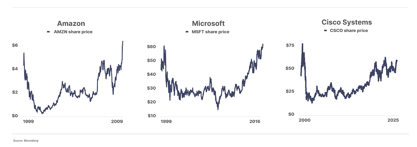 But, purchased at their peaks in early 2000, those stocks didn’t earn a dime for investors for years. Amazon’s share price didn’t recapture its 1999 peak until 2009… it took Microsoft 17 years to reclaim its 1999 highs… and today, Cisco shares are still 26% below their 2000 peak. That’s 25 years ago!