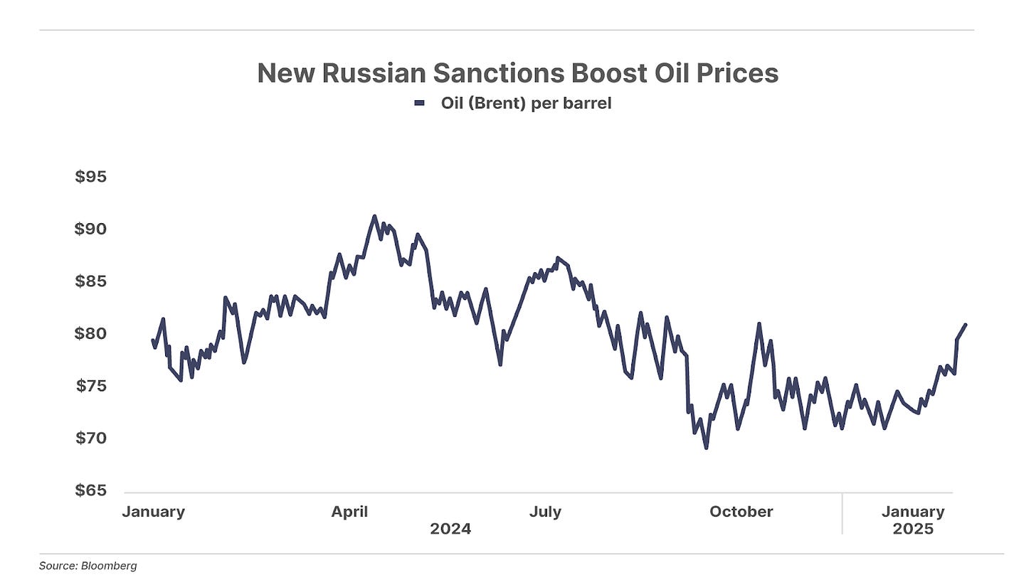 2. New Russian sanctions could accelerate oil rally. On Friday, the outgoing Biden administration more than tripled the number of Russian shipping vessels on the sanctions list to 183. Many of these vessels were part of the shadow fleet of tankers Russia used to divert oil from its former European customers into China and India. These new sanctions could take a significant volume of Russian oil supplies off the global markets, likely boosting crude oil prices, which are already up 10% for the year, and are at a three-month high.