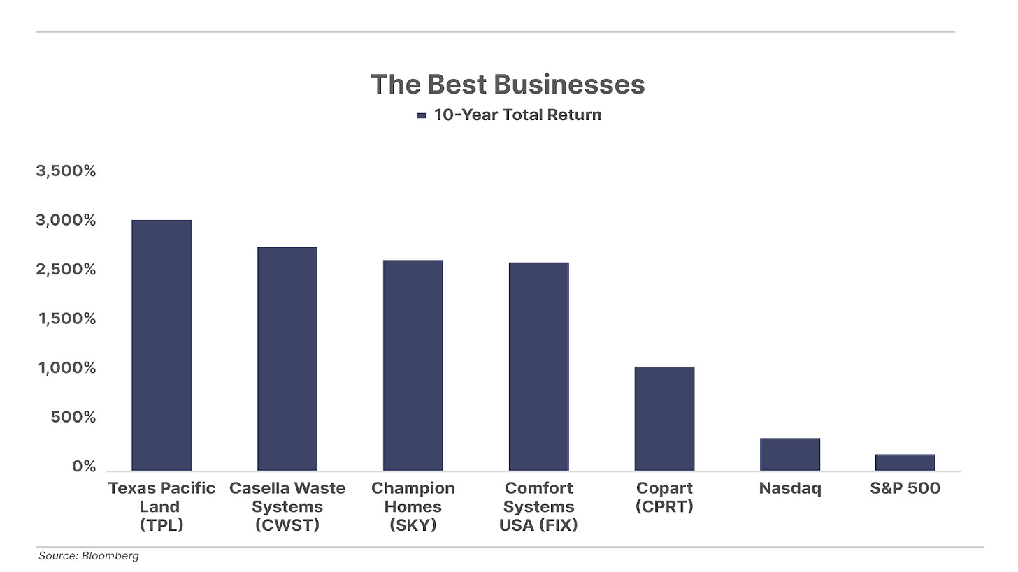 And the last example, Copart, is, like Texas Pacific Land, an incredible story of hiding in plain sight for decades. They own more than 200 junk yards in 11 different countries. Junk yards? Yep, that’s right. And guess what? Gross margins are close to 50%! Copart produces $1.5 billion in cash each year. This capital flows back into its own operations for growth (and more junk yards) and into its own shares ($1.4 billion in buybacks last decade).