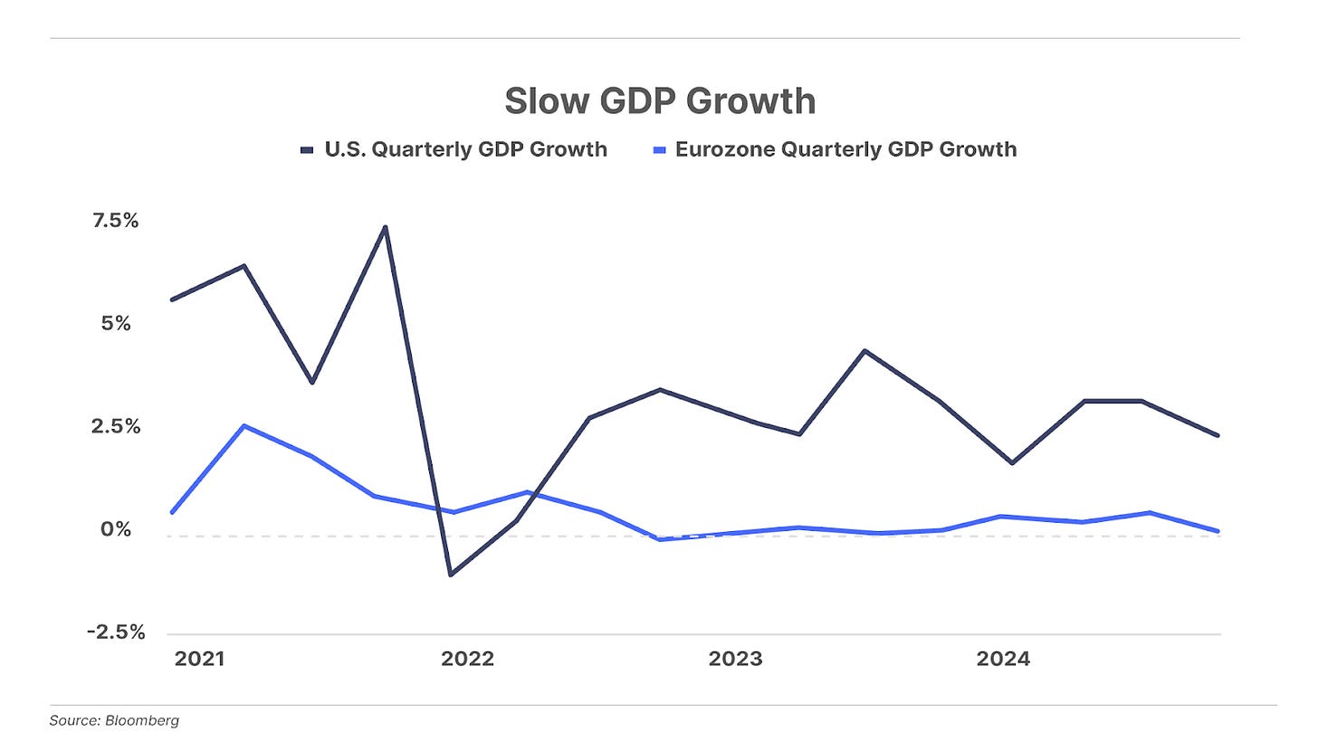 2. The global economy is weaker than advertised. U.S. Q4 GDP grew by 2.3%, falling short of Bloomberg’s consensus forecast of 2.6%. Growth in the U.S. isn’t so strong… and given how often GDP data is revised downward, it may be weaker than these initial numbers suggest. Still, though, the U.S. is trouncing no-growth Europe, where the economy didn’t grow at all during Q4 (and policymakers cut interest rates by a quarter point yesterday).