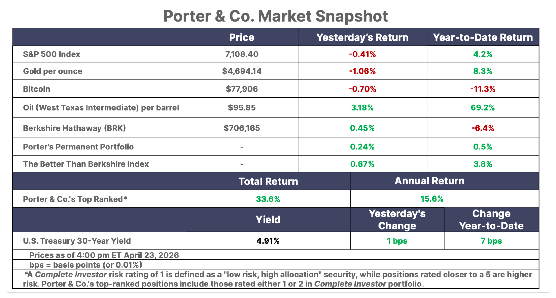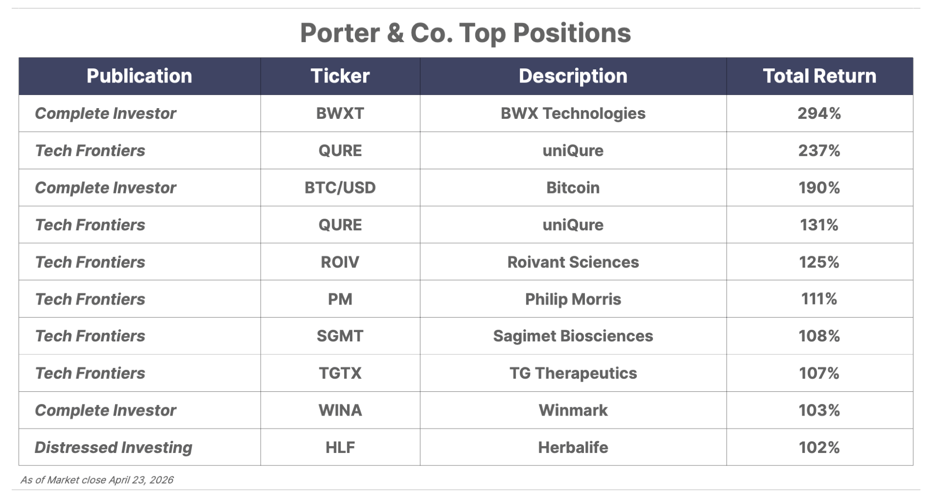 Please note: The investments in our “Porter & Co. Top Positions” should not be considered current recommendations. These positions are the best performers across our publications – and the securities listed may (or may not) be above the current buy-up-to price. To learn more, visit the current recommendations page of the relevant service, here. To gain access or to learn more about our current recommendations, call our Customer Care team at 888-610-8895 or internationally at +1 443-815-4447.