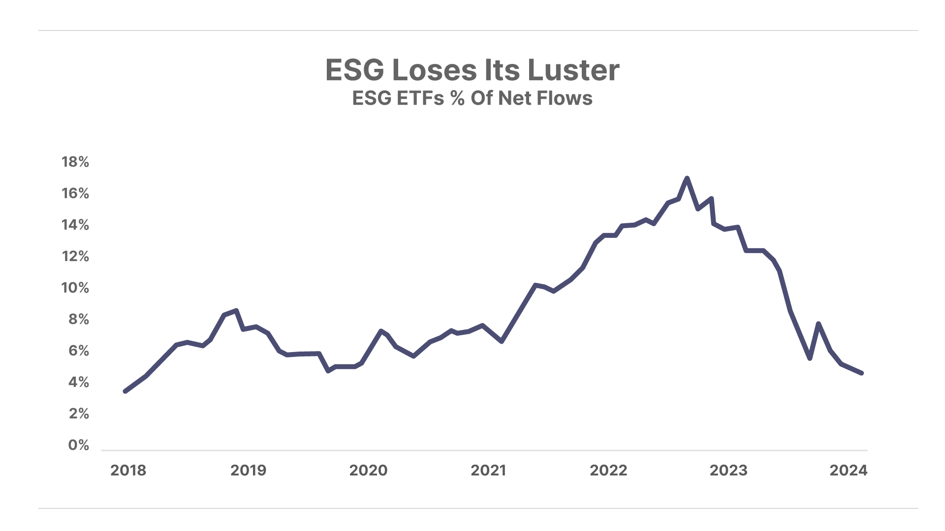 1. The ESG bubble has popped. Environmental, social, and governance (“ESG”)-related fund flows as a percentage of overall ETF flows have collapsed to their lowest levels since 2018. According to Morningstar, global sustainable funds hemorrhaged $84 billion in 2025 – the first annual net outflow since tracking began. ESG was never a performance strategy – it was a political strategy dressed up in performance language. You cannot exclude the most profitable sectors on Earth (energy, tobacco, defense) and compete with a broad index. This is why we own Philip Morris (PM), ExxonMobil (XOM), and other energy-related names in Complete Investor and Porter’s Permanent Portfolio.