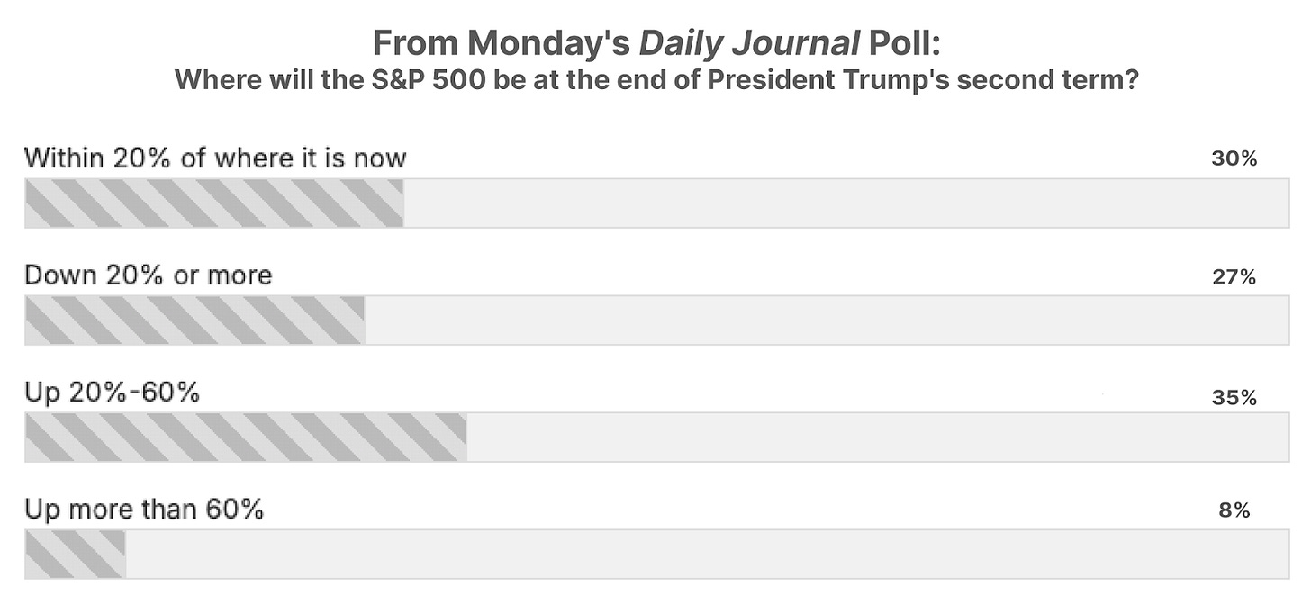 In the Daily Journal on Monday, President Donald Trump’s inauguration day, we asked readers: “Where will the S&P 500 be at the end of Trump’s second term?” And we got a mixed bag of results. Of those readers who took the survey, 35% selected “Up 20%-60%,” 30% checked “Within 20% of where it is now,” and 27% picked “Down 20% or more.” Just 8% of survey takers took the most bullish option of “Up more than 60%.”