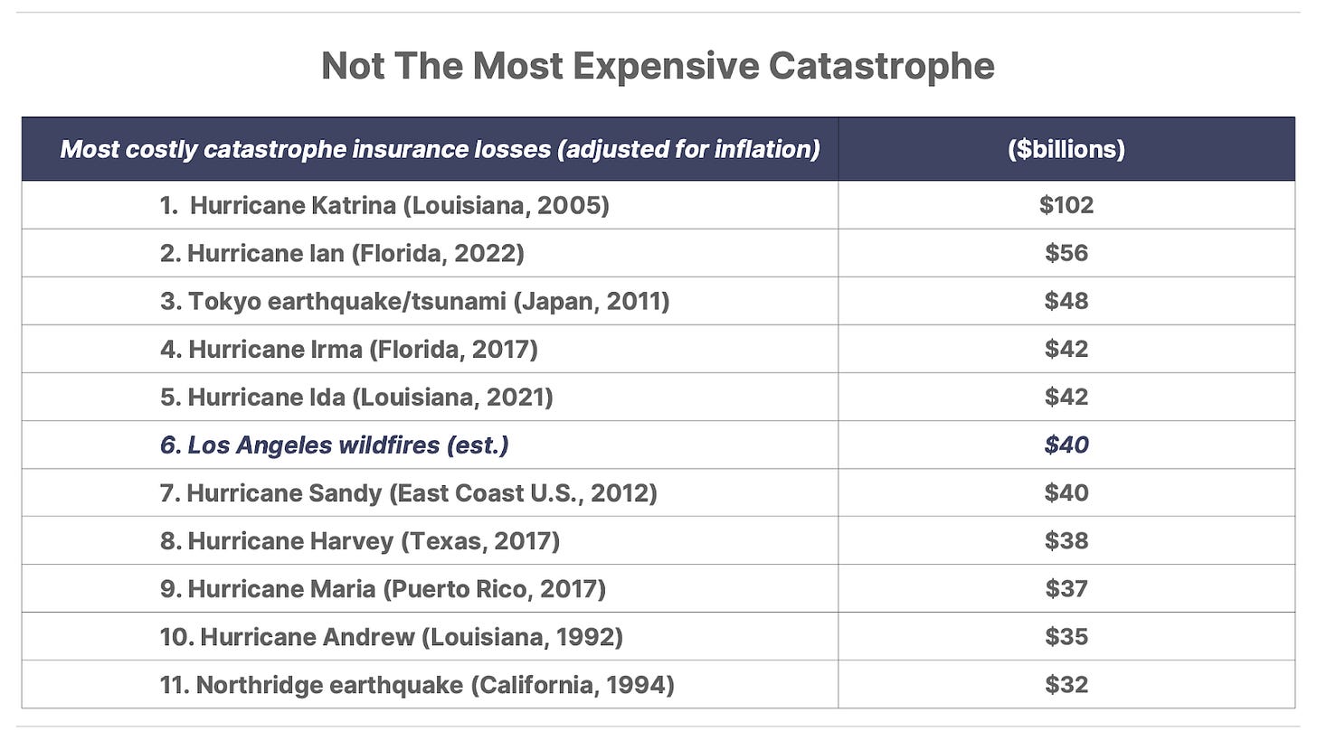 And, second, many homes in these very wealthy areas will simply not be insured. For example, for many years I owned homes on Flamingo Drive in Miami Beach. This street is only a few hundred feet from the ocean and runs alongside the Intracoastal Waterway. It is obviously prone to flooding and hurricane damage. In fact, one of the homes I bought had been knocked about six inches off its foundation from a tidal surge in the Great Miami Hurricane of 1926, which ended the first Florida land boom. As a result, getting insurance on these houses was incredibly expensive – equal to roughly 10% of the estimated value, every year. I chose to self-insure, as many wealthy people in the Pacific Palisades will have done, too (which means putting money aside to cover the cost of repair).