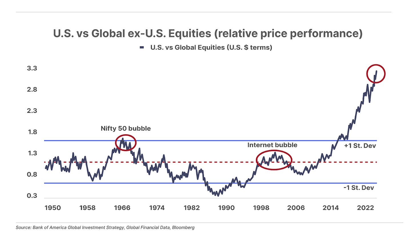 3. U.S. stocks are currently trading more than three standard deviations above global ex-U.S. stocks. That’s more than double the prior extremes seen at the peaks of the Nifty 50 bubble in the 1960s and the dot-com bubble in the early 2000s. We are in the midst of a generational financial bubble. And these things never end well. But, there’s always a bull market somewhere. And the next great bull market will be in foreign markets that adopt pro-growth policies, where you can buy good businesses at 4x or 6x earnings today. You’ll see more from us about these opportunities going forward.