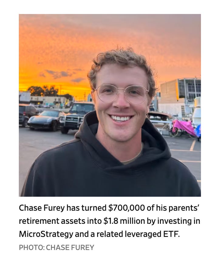 Educated at Harvard University, Chase recently convinced his parents to let him manage their $700,000 retirement account. He told the Journal that he’d created a “less dangerous and smarter” strategy for his parents. He put 100% of their account into two positions: shares of MicroStrategy (MSTR) and a 2x leveraged ETF that holds options on MicroStrategy stock. Chase expects Bitcoin to hit $400,000 and for MicroStrategy to increase by 10x… by next year. And, the strategy has worked so far: his parents’ capital has more than doubled!