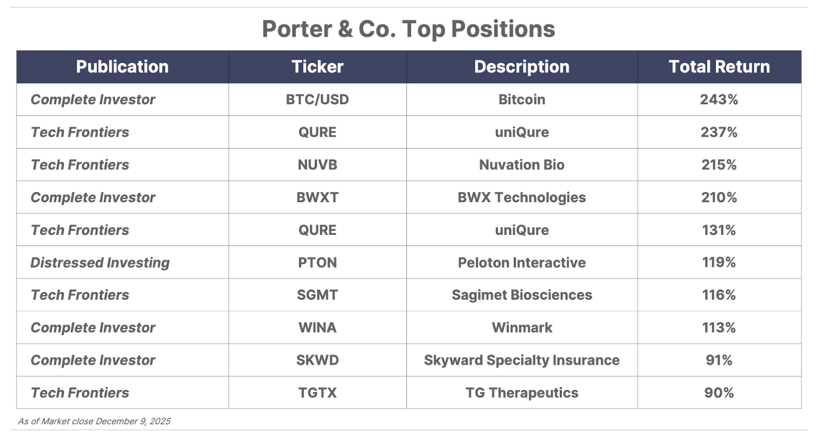 Please note: The investments in our “Porter & Co. Top Positions” should not be considered current recommendations. These positions are the best performers across our publications – and the securities listed may (or may not) be above the current buy-up-to price. To learn more, visit the current portfolio page of the relevant service, here. To gain access or to learn more about our current portfolios, call our Customer Care team at 888-610-8895 or internationally at +1 443-815-4447.