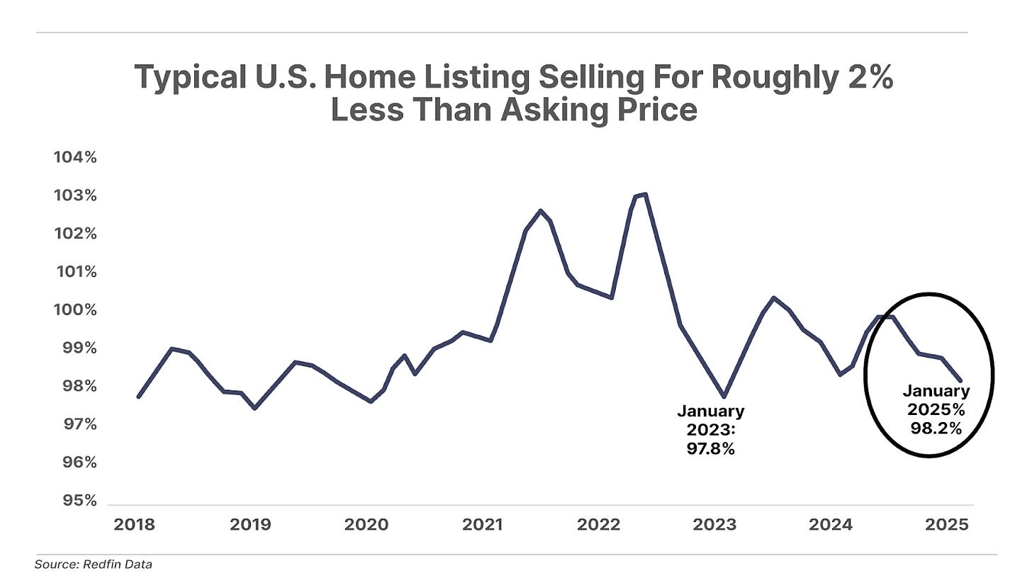 3. The U.S. housing market is slowly melting. The average U.S. house in January sold for 1.8% less than its asking price – the biggest discount in two years. And it’s taking longer for homes to sell: on average, a house is on the market for 56 days before the sale sign is removed from the front yard… the longest sales period since 2019. And so it’s not surprising that more than half of listings still aren’t under contract after having been on the market for 60 days. Weakness in the housing market reflects – like higher credit card delinquency rates – continued pressure on the consumer, and a faltering economy… and good news (for house buyers), as it may signal the beginning of residential real estate creeping back toward affordability.
