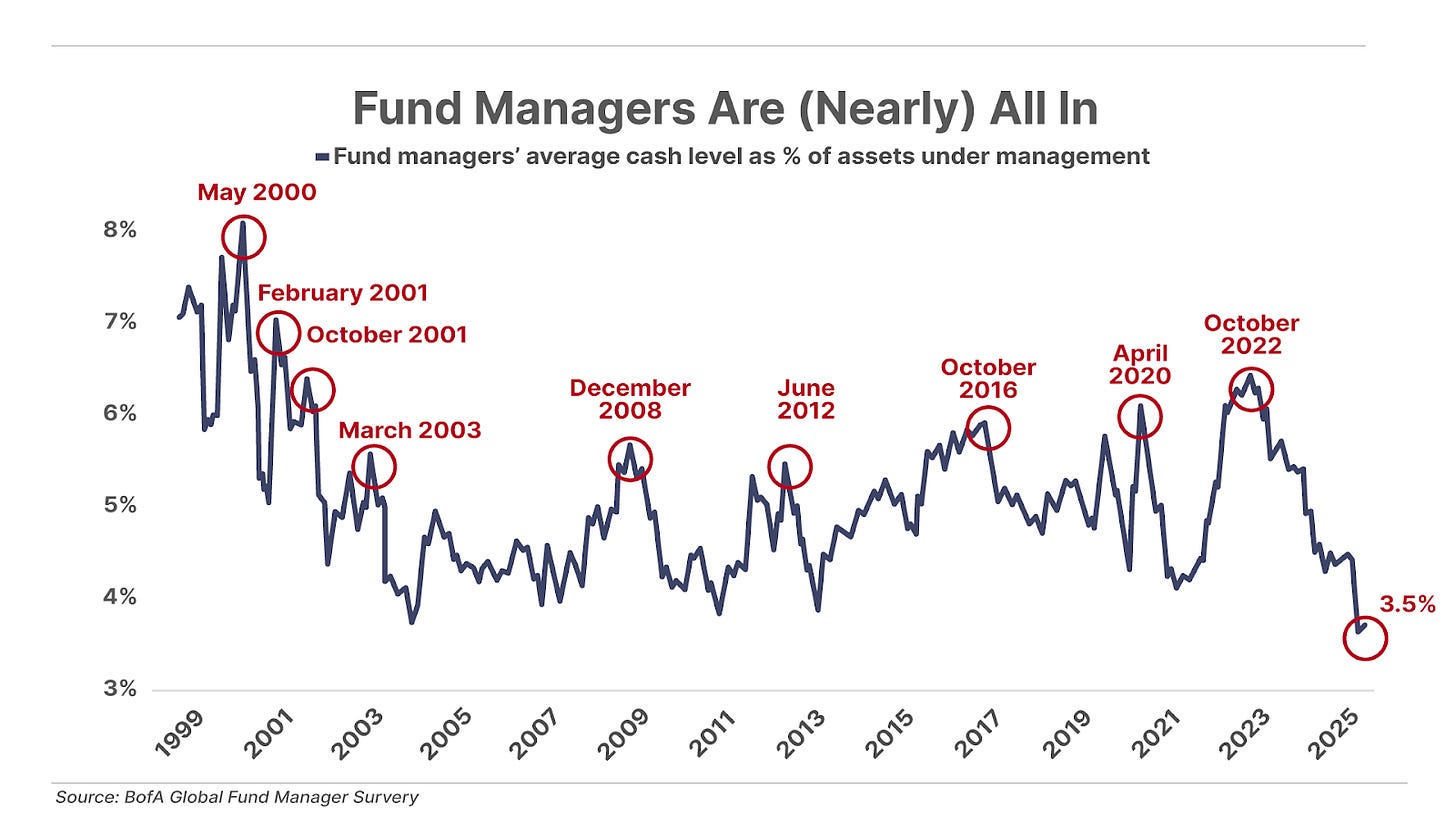 1. Fund managers show no fear. Bank of America surveyed 205 money managers, overseeing $482 billion in assets, revealing that cash levels have dropped to 3.5% of assets under management – which is the lowest level of cash in 15 years. The respondents also expressed little fear of a slowdown, with 82% believing a global recession is unlikely over the next year – the highest level of optimism since 2022. With so much money invested in the market, there’s little room for error in these bullish forecasts.