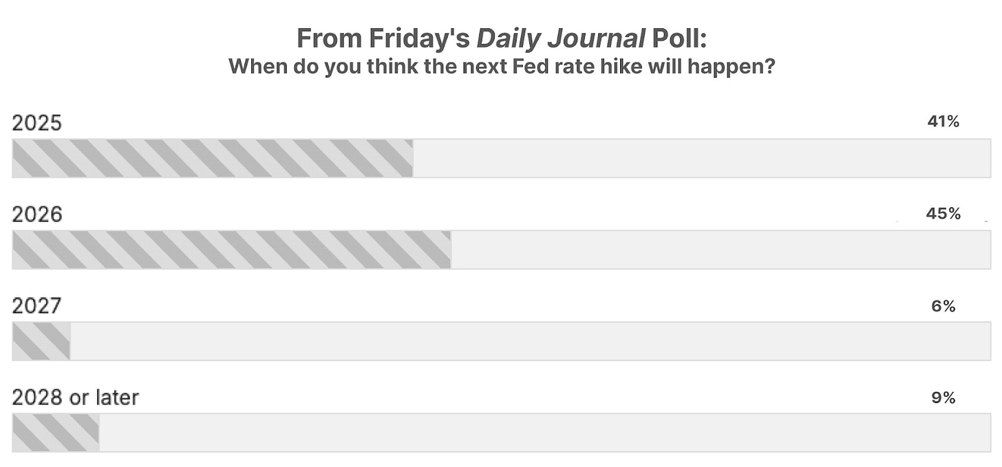 On Friday, our poll asked: “When do you think the next Fed rate hike will happen?” Ever since the Federal Reserve began to cut rates in September 2024, market chatter has centered on anticipation over the next rate cut… rather than the next rate hike.
