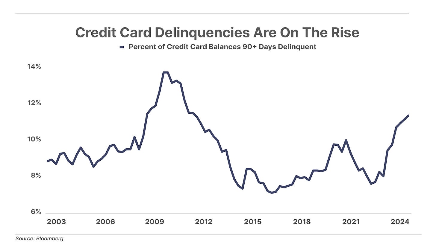 2. Growing consumer-credit delinquencies. Last week, we highlighted that consumer debt levels soared to record levels – over $5 trillion – as Americans turn to plastic to keep up with inflation. Now because of rising interest rates, consumers are struggling to repay these loans. The average credit card interest rate is 21.5%, compared to an average of 12.9% between 2010 and 2020. Serious delinquencies climbed to 11.4% in Q4 2024 – the highest level since 2011. Consumer defaults are on the rise, with the lower-income segment feeling the brunt of the financial strain. And when consumers can no longer lean on credit for cash to spend, they’ll have no choice but to slow their spending.