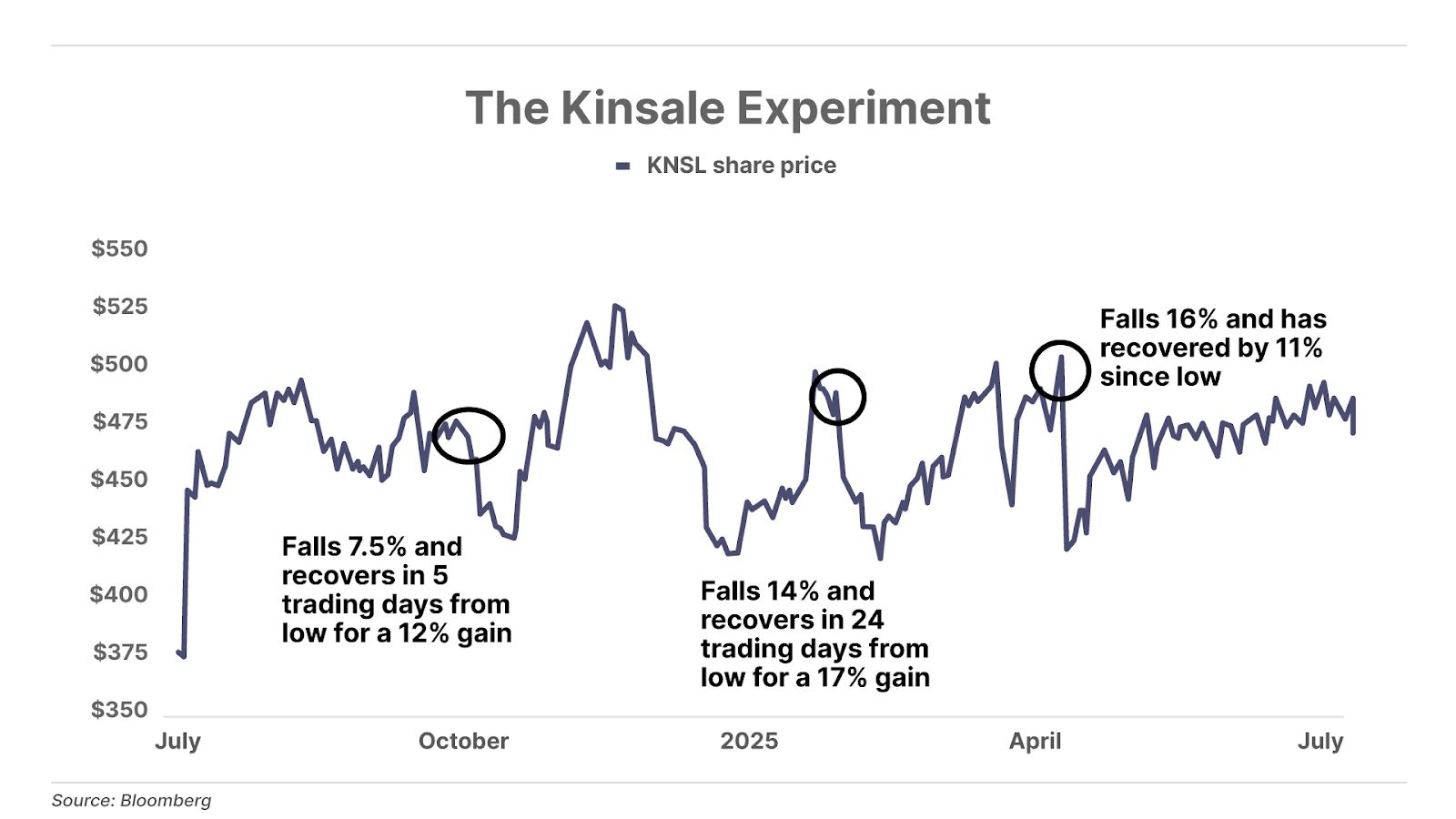 For example, when Kinsale reported Q1 2025 earnings on April 24, 2025, it produced $3.71 in earnings per share (“EPS”), beating the consensus forecast of $3.15 in EPS by a wide margin (+17.8%). But were investors impressed? Nope: the stock fell immediately, by about 13% after hours and then by another 16% on the next day. The stock went from $501 to $419, even though it reported great results!