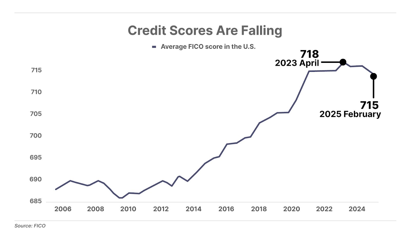 1. Credit scores drop. The average FICO credit score for Americans, which ranges from 350 (poor) to 850 (excellent), recently dropped for only the second time in a decade. Meanwhile, the total number of severe credit delinquencies – loans more than 90 days late on payment – have surpassed pre-COVID levels. Deteriorating credit scores and rising delinquencies suggest that the U.S. consumer is running out of money.
