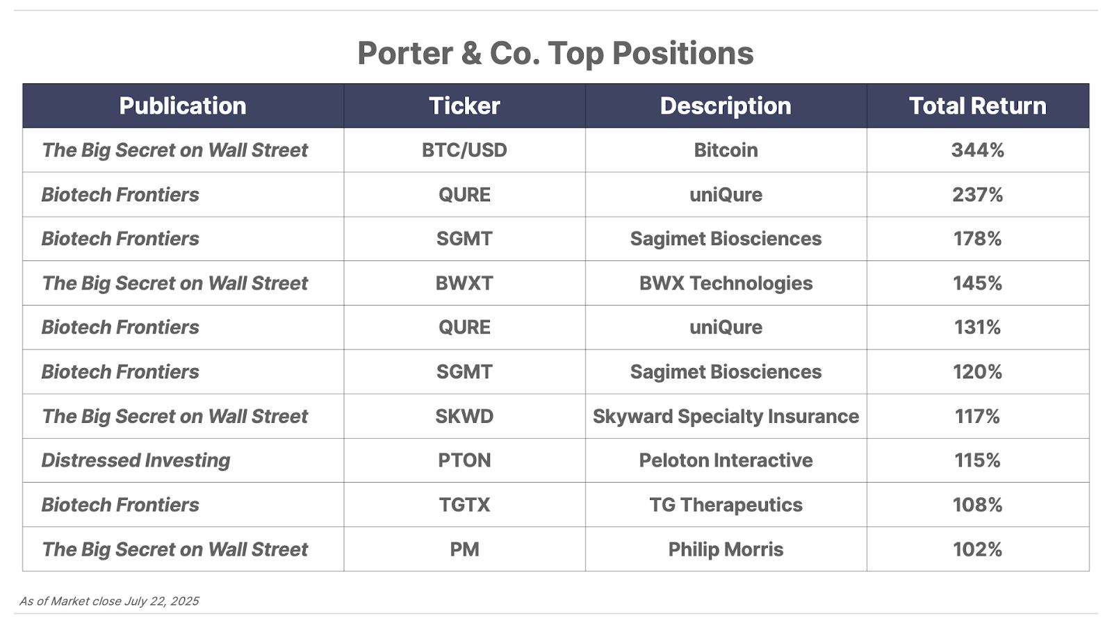 Please note: The investments in our “Porter & Co. Top Positions” should not be considered current recommendations. These positions are the best performers across our publications – and the securities listed may (or may not) be above the current buy-up-to price. To learn more, visit the current portfolio page of the relevant service, here. To gain access or to learn more about our current portfolios, call Lance James, our Director of Customer Care, at 888-610-8895 or internationally at +1 443-815-4447.