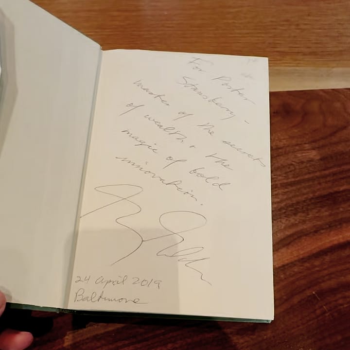 When I was in college, I read George’s book, Wealth and Poverty, cover to cover at least a dozen times. It taught me the basics of sound money and sound economic principles, and it taught me the beauty of capitalism. (I was so excited to have him join us that I asked him to sign my copy.)