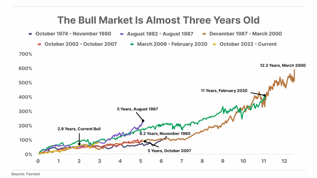 The current bull market is now approaching its third year – and history suggests it could have much further to run. Over the past five decades, bull markets lasting more than two years have gone on to last eight years, on average, with gains of 288%. As this cycle nears its third anniversary in October, conditions remain supportive: inflation is running hot, and the Fed is likely to lower rates.