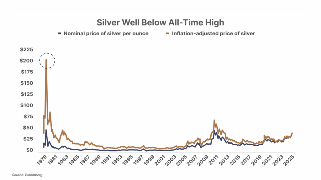 1. Silver has a lot of catching up to do. On Friday, we noted gold had finally reached a new inflation-adjusted high. However, while silver – currently trading around $42 per ounce – is closing in on its nominal all-time high near $50, it remains well below its high when adjusted for inflation. As the chart below shows, when accounting for consumer price index (“CPI”) inflation, silver would need to trade above $200 per ounce to reach its peak set in 1980.