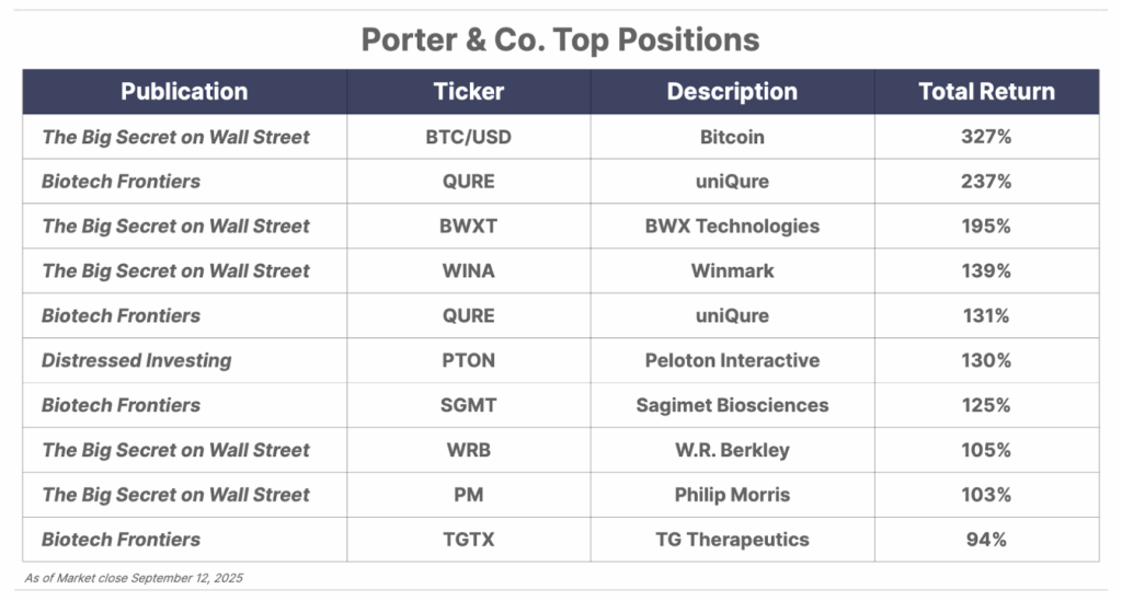 Please note: The investments in our “Porter & Co. Top Positions” should not be considered current recommendations. These positions are the best performers across our publications – and the securities listed may (or may not) be above the current buy-up-to price. To learn more, visit the current portfolio page of the relevant service, here. To gain access or to learn more about our current portfolios, call our Customer Care Team at 888-610-8895 or internationally at +1 443-815-4447.