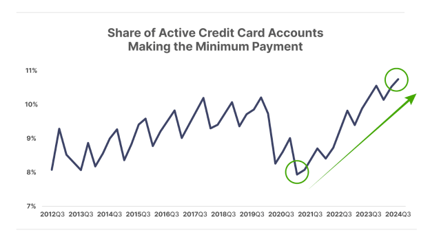 2. Growing consumer credit stress. The percentage of active credit card account holders making just the minimum payment rose to 10.8% in the third quarter of 2024, according to the Federal Reserve – a 38% increase over the past four years, to the highest level of those making just the minimum payment since at least 2012. Credit card 30-plus day delinquencies have also doubled over the past four years to 3.5%.