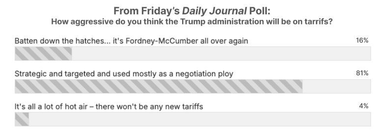 In Friday’s Daily Journal, Porter was critical of President Trump’s plans to impose tariffs on America’s trading partners. Our survey on Friday asked readers: “How aggressive do you think the Trump administration will be on tariffs?” The results were nearly unanimous: 81% of survey takers selected the option “Strategic and targeted and used mostly as a negotiation tool,” while 16% voted for “Batten down the hatches… it’s Fordney-McCumber all over again,” referring to the 1922 tariff law, mentioned in Friday’s essay, that decimated the U.S. economy. Just 4% feel that “It’s just a lot of hot air…”