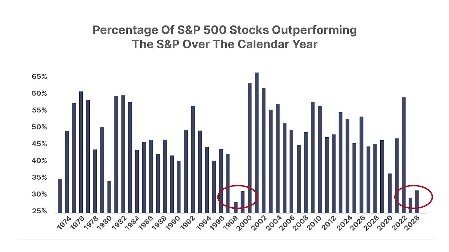 3. When a small number of stocks accounts for almost all of the market’s gains… Most of the time, the performance of a stock index roughly reflects the average performance of the stocks in the index. Over the long term, around half of the stocks in the S&P 500 Index have outperformed the index on an annual basis (and half have… wait for it… underperformed). But in 2024, just 32% of the constituent stocks of the S&P 500 have outperformed the index… meaning that 68% have done worse than the 29% year-to-date return of the S&P 500. That kind of lopsided performance has happened only a few times in the past: in 2023… and in 1998 and 1999, just before the dot-com bust. Market breadth is a signal of a healthy rally, which is the opposite of what we have today. Don’t say we didn’t warn you…