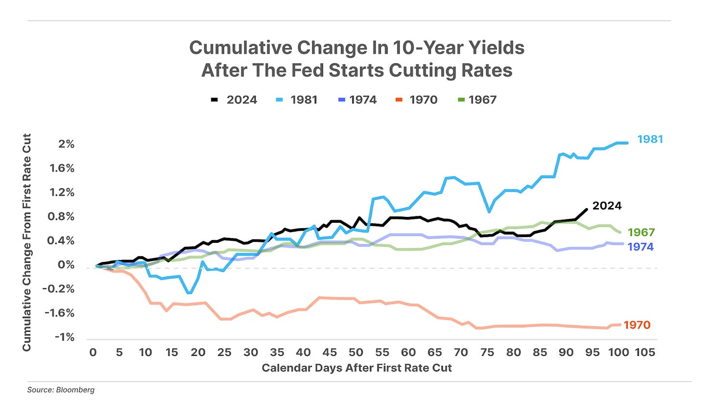 The bond market knows what's coming. That's why, as the Federal Reserve has continued to cut interest rates – including another 25 basis points on Wednesday – bond yields have been moving up. That's not completely unprecedented, but – as the graph below shows – we're seeing the biggest rise in yields during an interest rate cutting cycle in decades. The last time bonds behaved this way, in the pre-1981 cutting cycle (the light-blue line below)... during which inflation and yields hit century highs.