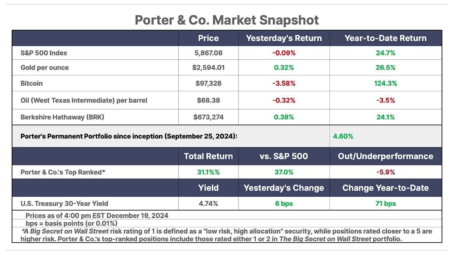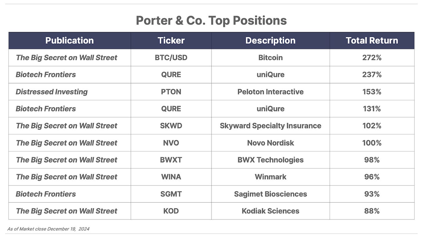 This is Porter & Co.’s free daily e-letter… the last one of 2024. Paid-up members can access their subscriber materials, including our latest recommendations and our “3 Best Buys” for our different portfolios, by going here.