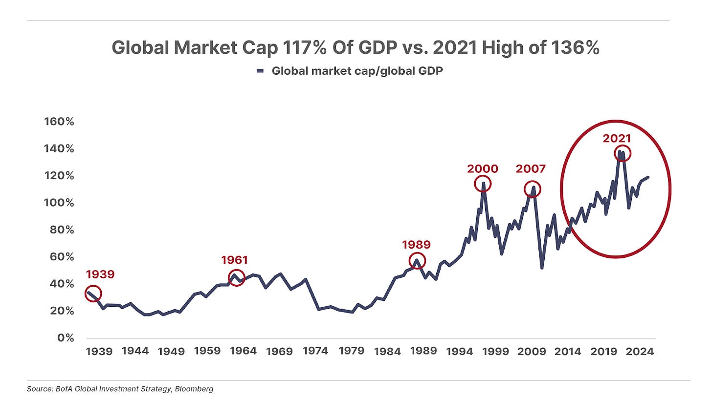 2. The Buffett indicator flashes red. Warren Buffett’s favorite valuation metric compares the value of the broad stock market to gross domestic product (“GDP”). When the metric is above 100%, it suggests that stocks are overvalued relative to the economy. For the U.S., the ratio just hit a new high of 205% (meaning the total value of U.S. markets are more than twice GDP) – well above the dot-com-bubble peak and the 120% 20-year average. Meanwhile, on a global basis (global stock markets compared to global GDP), the indicator is closing in on 2021 all-time highs. Equity markets are frothy everywhere… No wonder Buffett is hoarding cash.