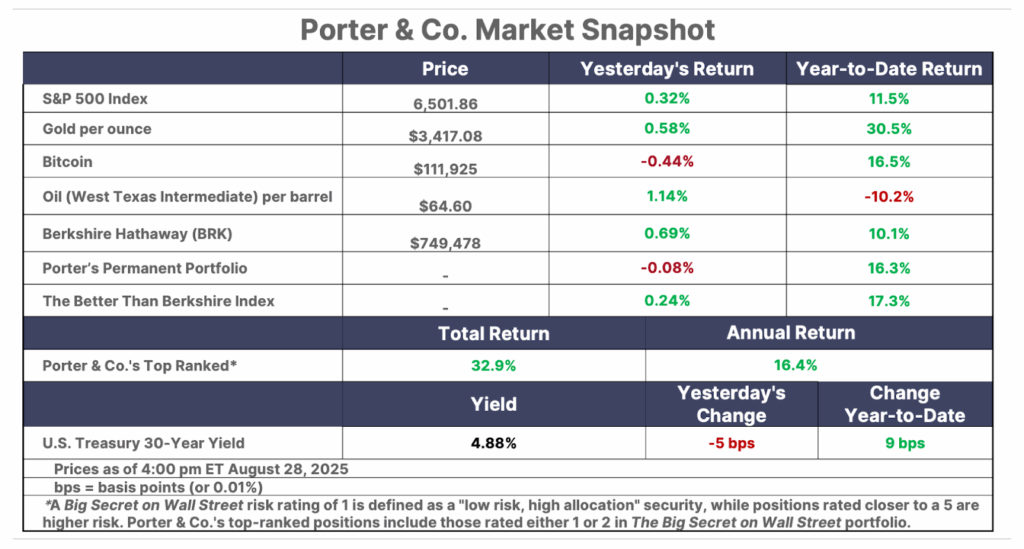 This is Porter’s Daily Journal, a free e-letter from Porter & Co. that provides unfiltered insights on markets, the economy, and life to help readers become better investors. It includes weekday editions and two weekend editions… and is free to all subscribers.