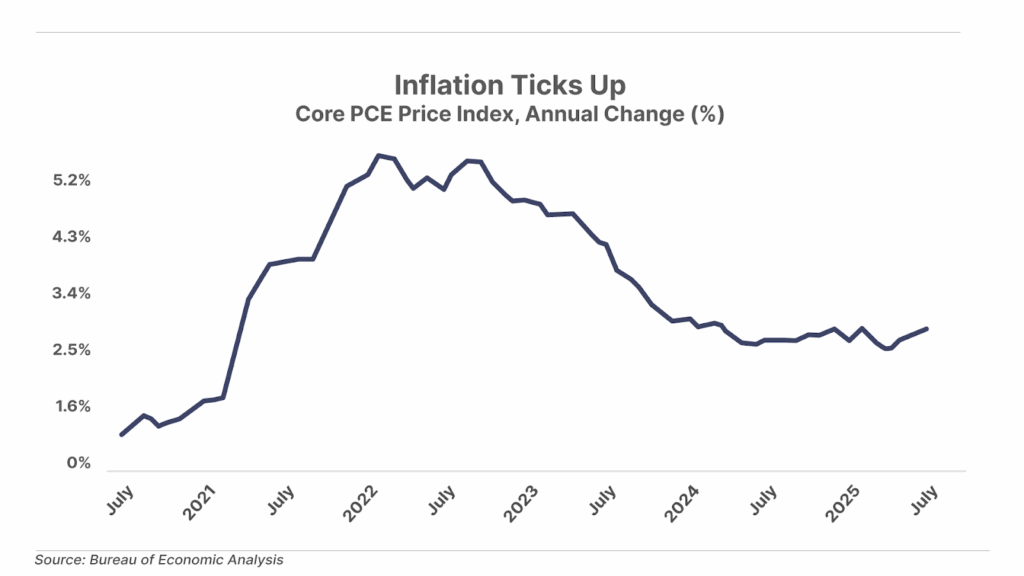 1. Inflation continues to tick higher. This morning, the Bureau of Economic Analysis reported that the personal consumption expenditures (“PCE”) price index – the Federal Reserve’s preferred measure of inflation – rose 0.2% month-over-month (2.6% annual rate) in July. Core PCE – which excludes food and energy prices – rose 0.3% (2.9% annual rate) in July. While both measures matched Wall Street expectations, the latter represents the highest annualized inflation rate since February and the third consecutive monthly increase. Despite the sticky inflation, the market remains convinced the Fed will cut rates next month, with the probability of a 25 basis point cut rising to 86.9% this morning, according to the CME’s FedWatch tool.