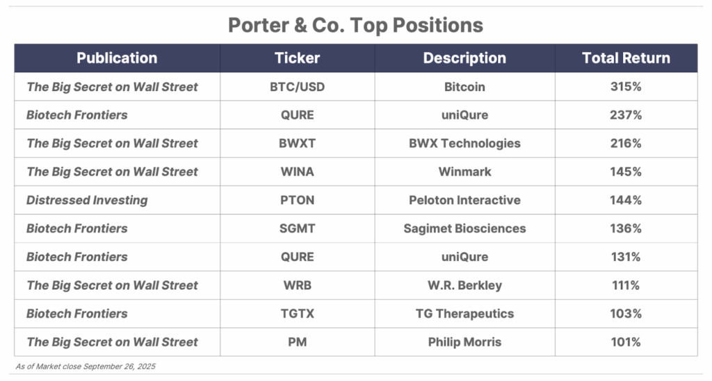 Please note: The investments in our “Porter & Co. Top Positions” should not be considered current recommendations. These positions are the best performers across our publications – and the securities listed may (or may not) be above the current buy-up-to price. To learn more, visit the current portfolio page of the relevant service, here. To gain access or to learn more about our current portfolios, call our Customer Care team at 888-610-8895 or internationally at +1 443-815-4447.