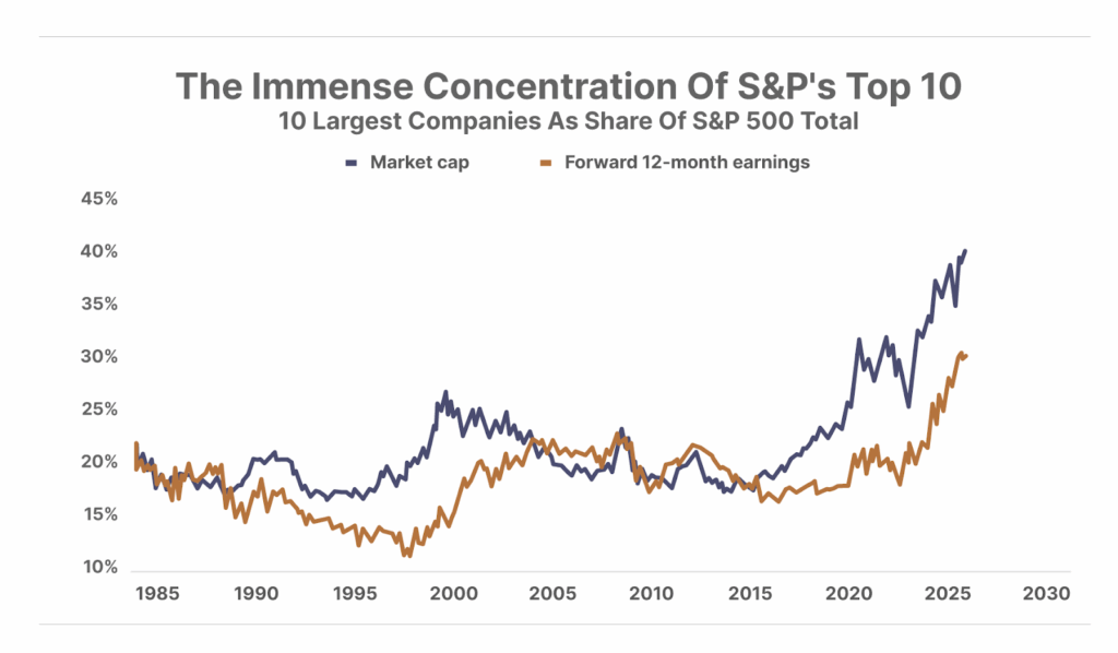 2. The S&P 500 or S&P 10? The S&P 500 is meant to track the performance of America’s 500 largest companies. Today the top 10 stocks account for 40% of the index’s weight – yet those same companies represent only 30% of the index’s projected earnings over the next year. This widening gap highlights how concentrated the index has become – and how richly valued the largest 10 names are compared to the other 490. If growth in the hyperscalers falters, the illusion of broad market strength could quickly unravel.