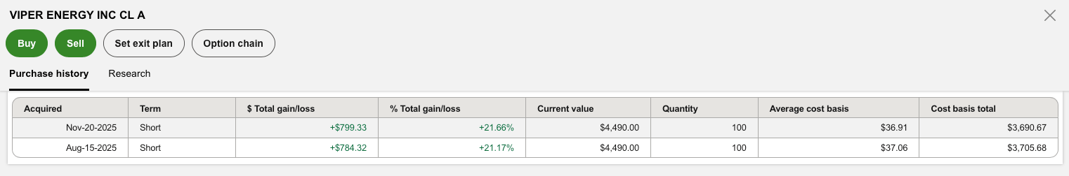 One week later on August 22, we sold another Viper Energy (VNOM) $40 cash-secured put, expiring November 21, 2025, for $204 in net cash proceeds, or $2.04 per share.