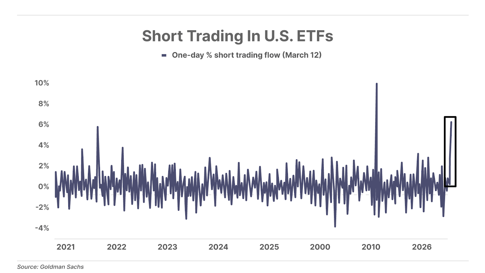 1. Hedge funds are very bearish. Short positions in U.S.-listed ETFs surged 10% last Thursday, the second-largest single-day increase in a decade, pushing total short exposure to the 2022 bear-market peak of 11.6%. Funds are betting heavily against the market due to the energy crisis caused by the war in Iran.