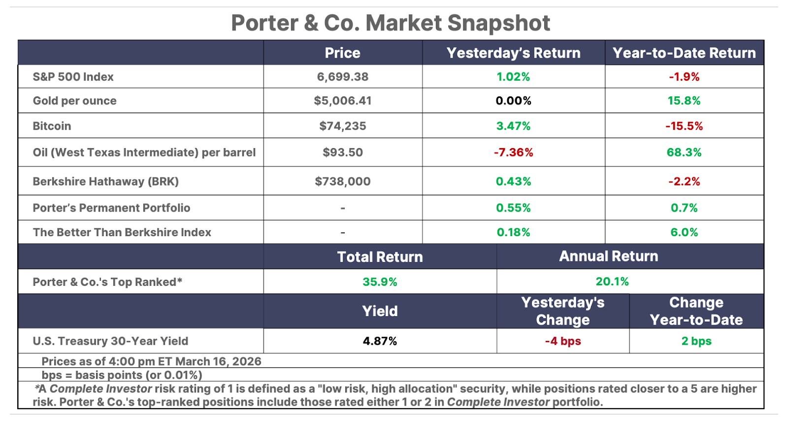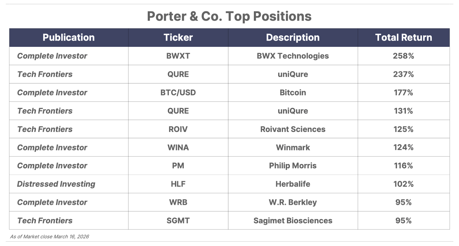 Please note: The investments in our “Porter & Co. Top Positions” should not be considered current recommendations. These positions are the best performers across our publications – and the securities listed may (or may not) be above the current buy-up-to price. To learn more, visit the current portfolio page of the relevant service, here. To gain access or to learn more about our current recommendations, call our Customer Care team at 888-610-8895 or internationally at +1 443-815-4447.