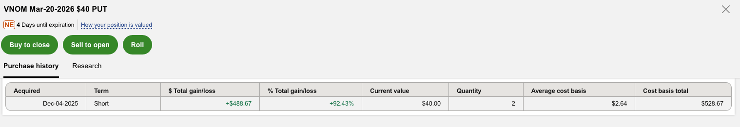 Finally, we repeated a similar trade on December 4, this time selling two Viper Energy (VNOM) $40 cash-secured puts, expiring March 20, 2026. We received $528 in net cash proceeds, or $2.65 per share. This is currently an open trade with just a few days left until expiration, as shown below: