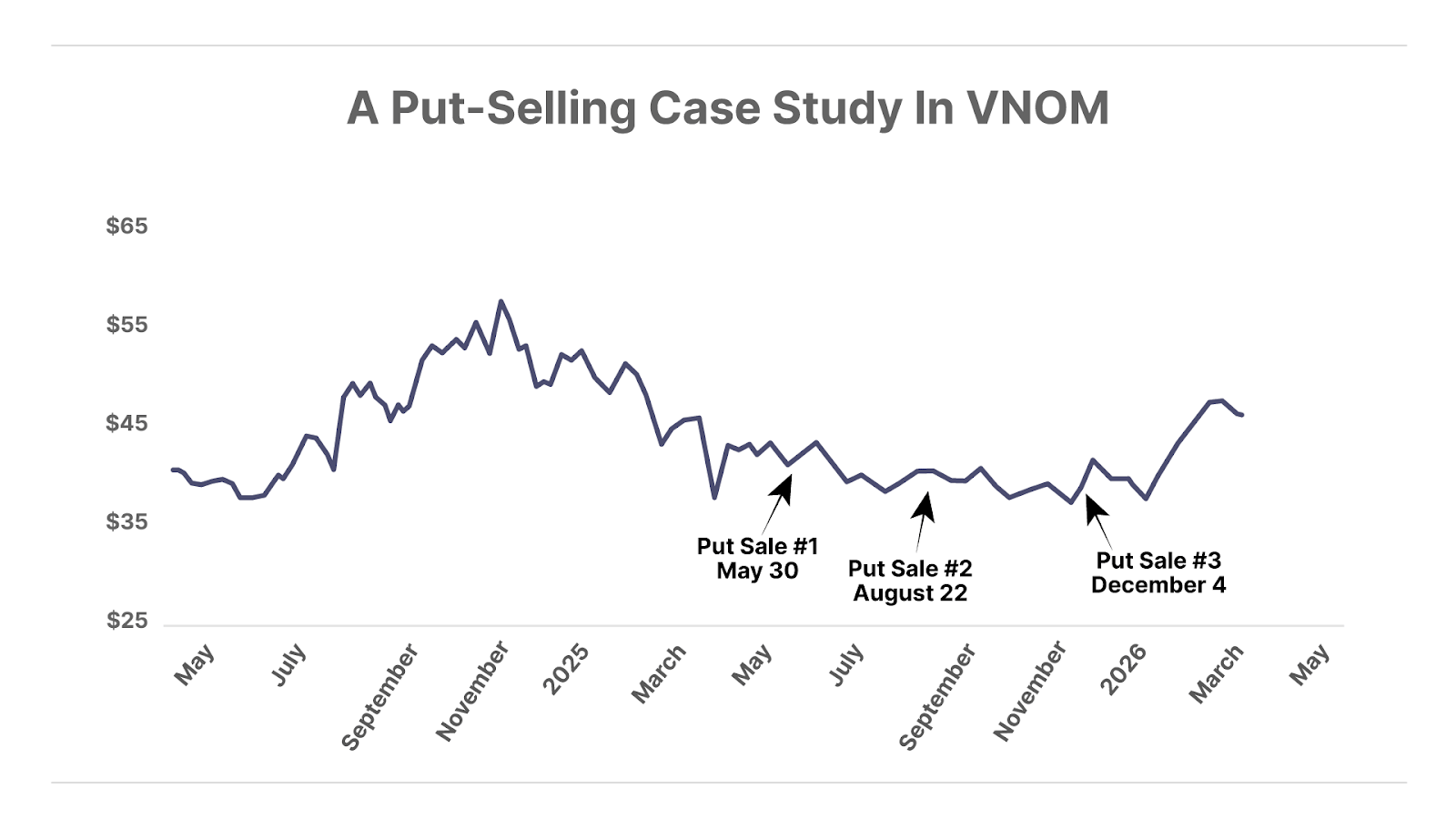 One of our highest-conviction ideas of the past year was in shares of Permian oil and gas royalty company Viper Energy (VNOM), which we identified as an excellent value at $40 per share. On three separate occasions when VNOM shares traded near this price, we sold $40 strike puts, as notated on the chart below: