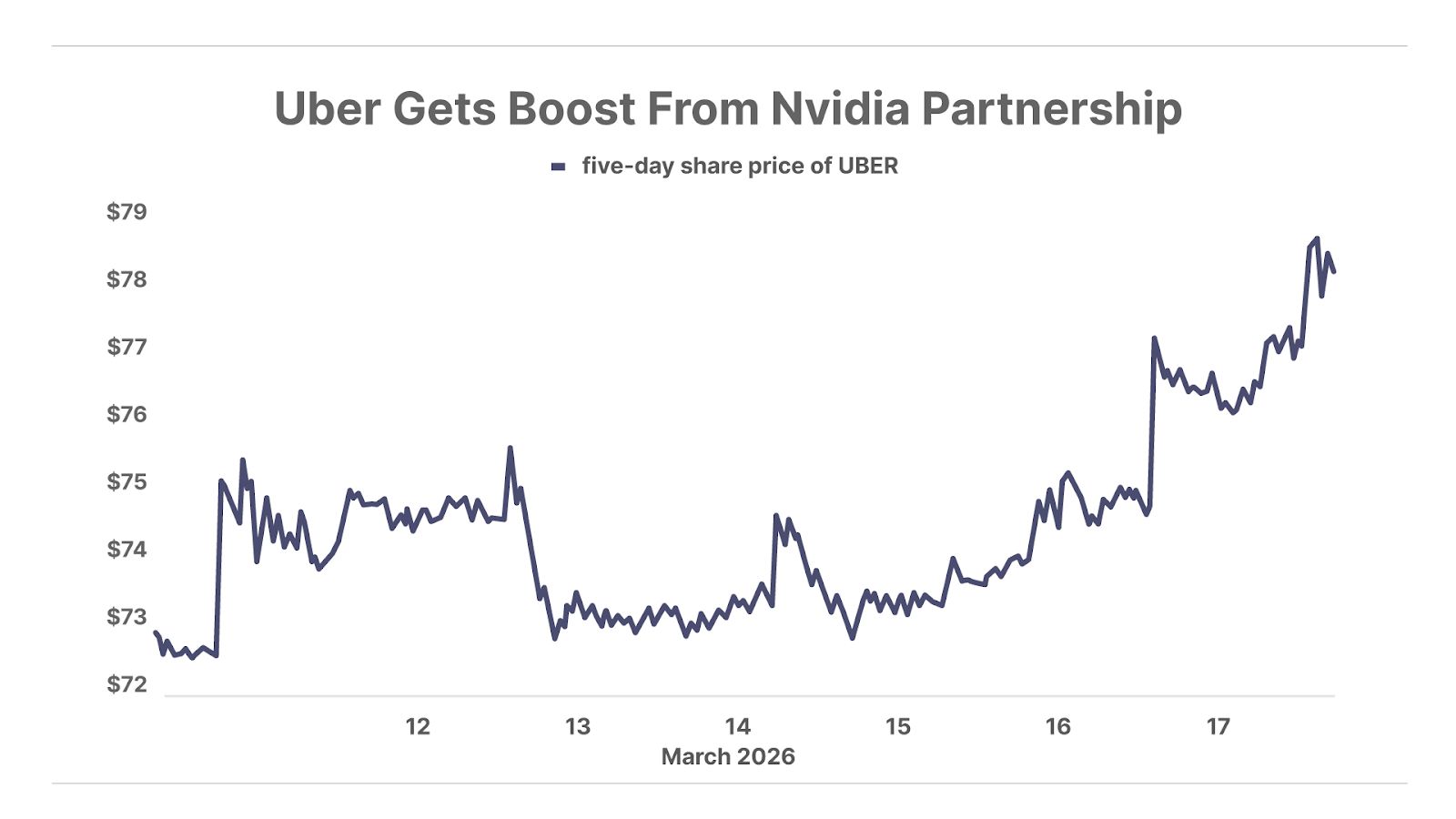 Uber Technologies (UBER) announced that it will deploy Level 4 autonomous taxis powered by Nvidia’s Alpamayo AI and DRIVE Hyperion platform – starting in Los Angeles next year and expanding to 28 cities globally by 2028… Shares of Uber (a Complete Investor recommendation) are up more than 8% over the past week.
