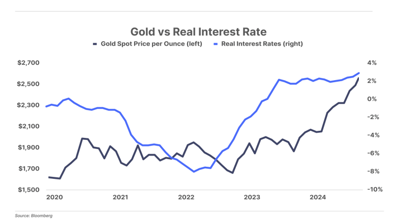 1. The Federal Reserve cut rates 50 basis points today, but don’t expect more rate cuts. Why not? Because gold is trying to tell us that inflation isn’t over. As the chart below shows, since the end of the COVID bubble in the bond market (around mid 2021), the price of gold has rallied strongly while real interest rates (not nominal rates!) have fallen. This is exactly how the price of gold should move in the face of a long period of high inflation. What’s surprising is, since the fall of 2022, after the Fed raised rates aggressively to contain inflation, real interest rates have been relatively strong, but gold has continued to rally. And now, with the Fed cutting rates, gold continues to rally. This suggests that a return to negative real interest rates (1-year Treasury notes yielding less than inflation) will soon happen.