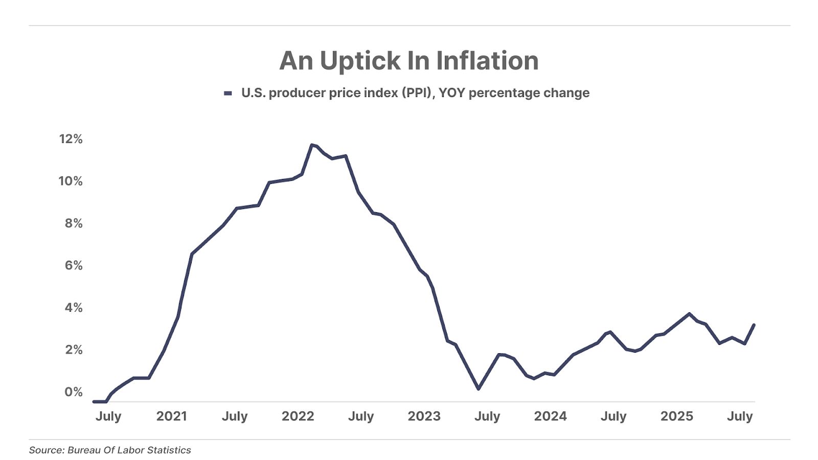 1. Producer price inflation surprises to the upside. On Thursday, the Bureau of Labor Statistics reported that its producer price index (“PPI”) – a measure of the selling prices received by U.S. producers for their output – rose 0.9% in July (3.3% year-over-year), versus Wall Street expectations of just 0.2% (2.5% year-over-year)… the largest monthly jump in more than three years. Rising producer prices often feed into rising consumer prices, suggesting consumer inflation could be headed higher. Despite this inflation surprise, the market still expects the Federal Reserve to cut interest rates next month, with the CME’s FedWatch tool showing a 90% chance of a 25-basis-point cut.