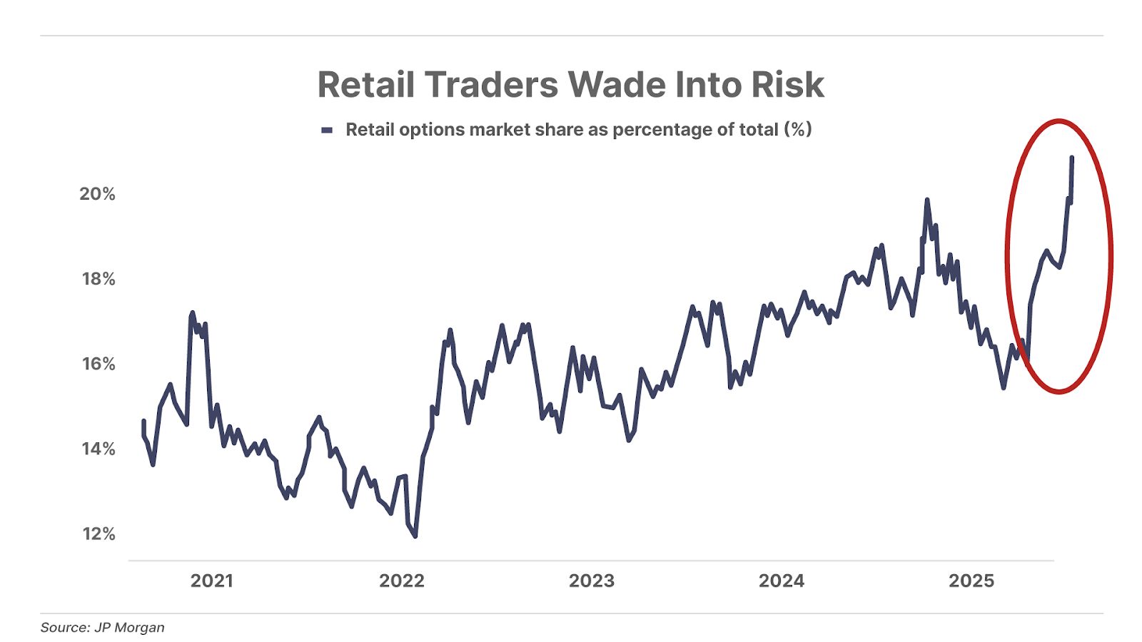 3. The latest sign of speculative frenzy. The share of retail options trading has surged to over 20% over total trading activity, a record high. The majority of options trading has historically been among large, institutional investors hedging their portfolios. But more recently, retail traders have turned to options as a way of juicing their market exposure with cheap but high-risk leverage – yet another sign of everyday traders venturing far out onto the risk curve in today’s market.