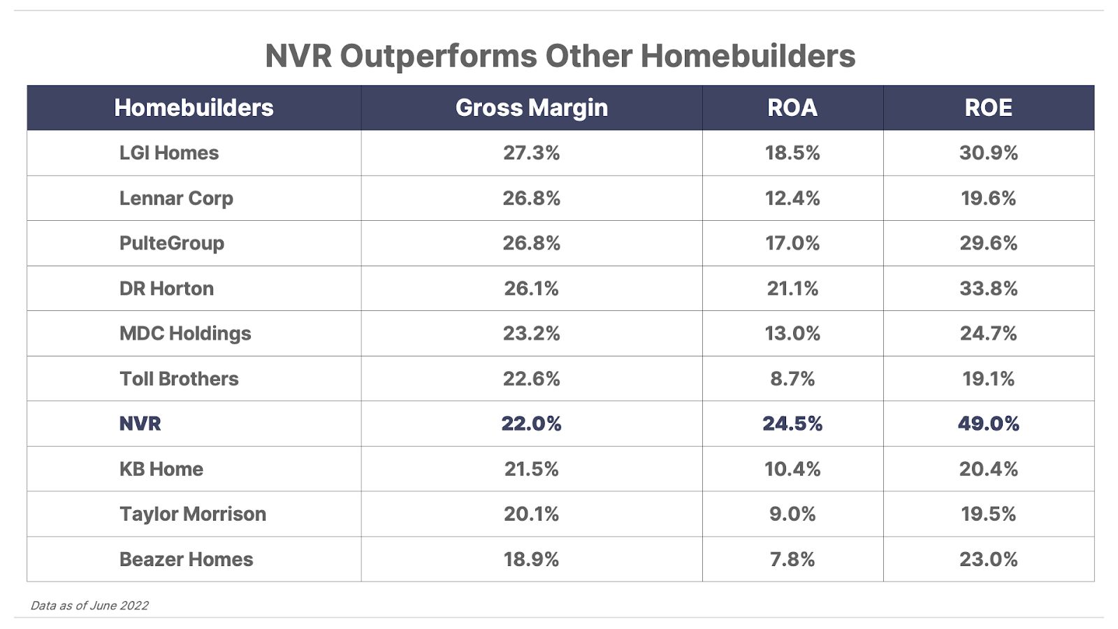 But that’s where the similarities end. If you dig a little deeper, you’ll see that NVR’s return on assets (“ROA”) and return on equity (“ROE”) are significantly higher than other homebuilders. In fact, NVR’s ROE is more than double the industry average.