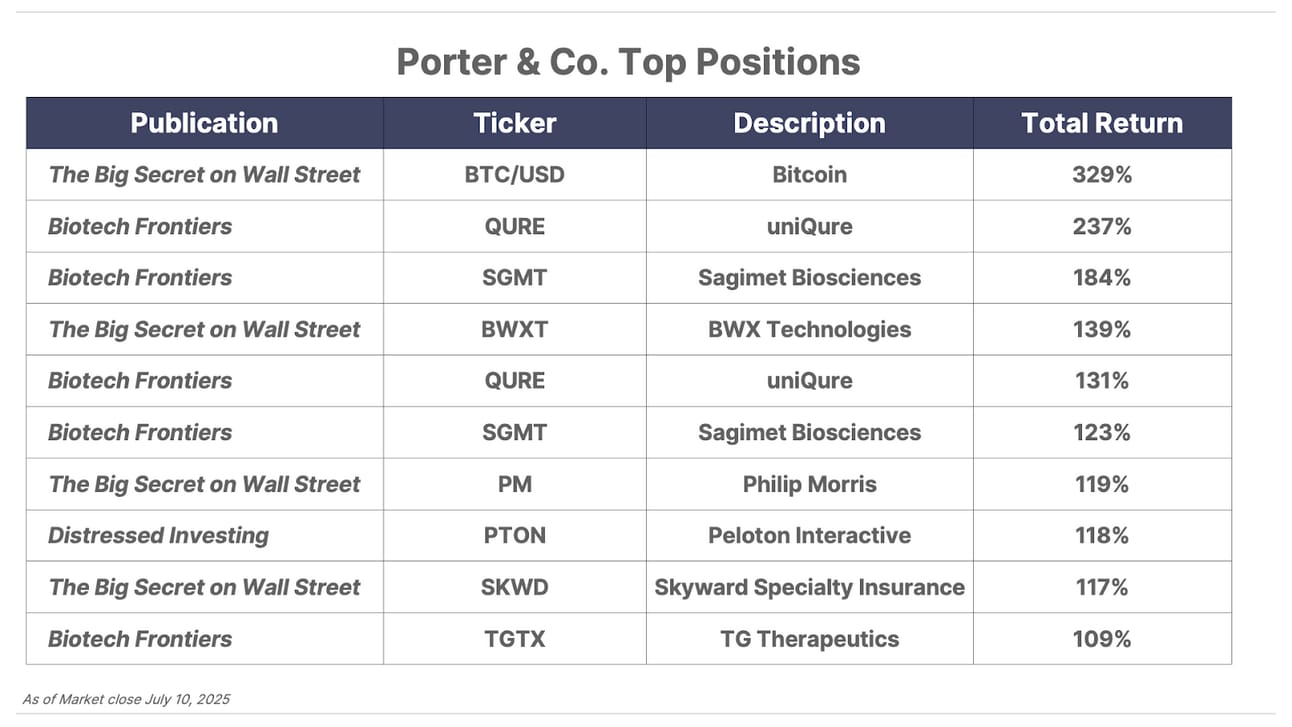 Please note: The investments in our “Porter & Co. Top Positions” should not be considered current recommendations. These positions are the best performers across our publications – and the securities listed may (or may not) be above the current buy-up-to price. To learn more, visit the current portfolio page of the relevant service, here. To gain access or to learn more about our current portfolios, call Lance James, our Director of Customer Care, at 888-610-8895 or internationally at +1 443-815-4447.