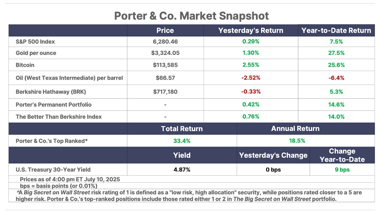 This is Porter’s Daily Journal, a free e-letter from Porter & Co. that provides unfiltered insights on markets, the economy, and life to help readers become better investors. It includes weekday editions and two weekend editions… and is free to all subscribers.