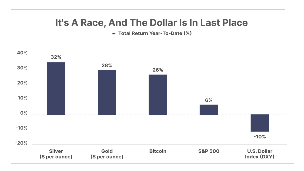 1. An asset boom at the dollar’s expense. The S&P 500, Bitcoin, and gold are all at all-time highs, with silver up 32% year-to-date and at a 14-year high. Bitcoin topped $118,000, up 26% for the year. Meanwhile, the mighty dollar is down 10%, the worst start to a year since 1973 as fears of ballooning U.S. federal deficits cause investors to lose confidence in the greenback. Investors are turning to hard assets like gold, silver, and Bitcoin as hedges against a weakening dollar and mounting U.S. debt.
