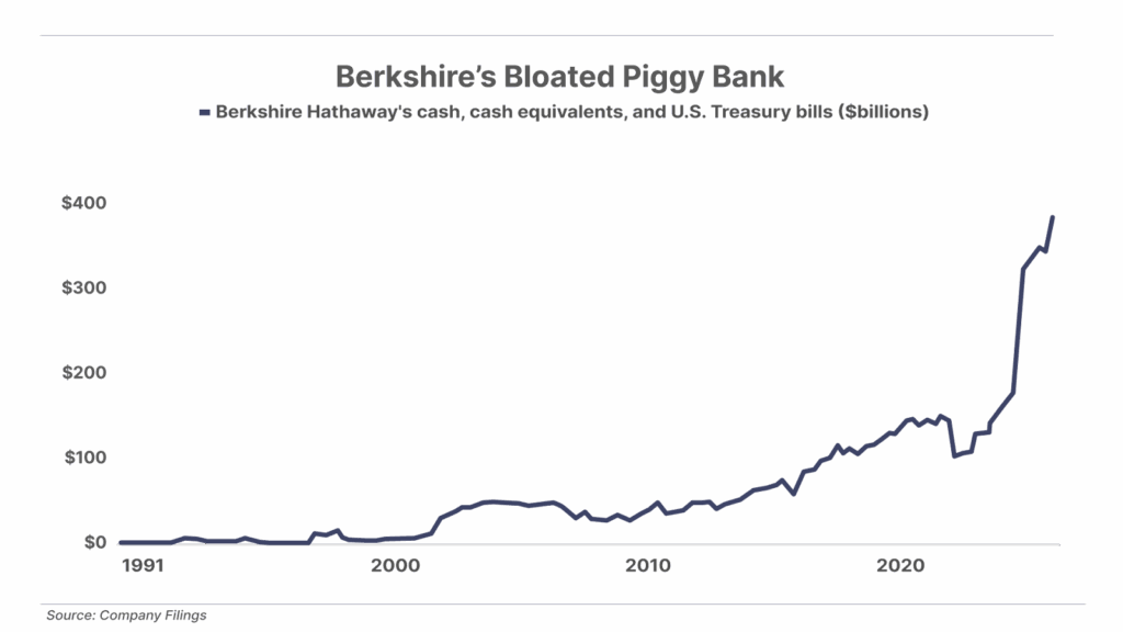 3. Berkshire continues selling stocks and raising cash. Warren Buffett’s Berkshire Hathaway released its Q3 financials over the weekend – reporting an impressive 34% increase in operating profit, driven by strong performance in its insurance business. But the thing that caught our attention was that Berkshire sold another $6.1 billion of stocks, marking the 12th consecutive quarter of net selling. This brought Berkshire’s cash pile to a new record high of $382 billion. Buffett – or his CEO successor – is poised to pounce on some deals when they emerge.