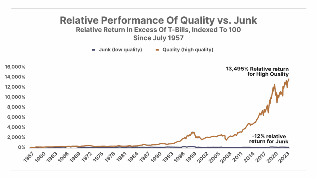 This research begins with the U.S. stock market in 1956 and continues (updated on AQR’s website) every month. These portfolios are value-weighted and rebalanced every calendar month to maintain their accuracy. Quality is defined as the top two portfolios of the quality deciles. And “junk” is defined as the bottom two portfolios of the quality deciles.