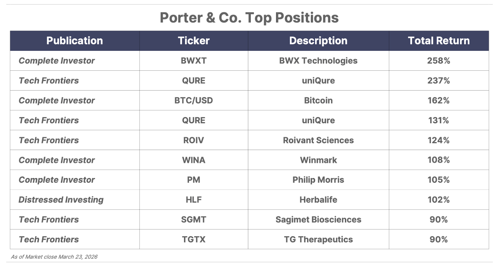 Please note: The investments in our “Porter & Co. Top Positions” should not be considered current recommendations. These positions are the best performers across our publications – and the securities listed may (or may not) be above the current buy-up-to price. To learn more, visit the current portfolio page of the relevant service, here. To gain access or to learn more about our current recpmmendations, call our Customer Care team at 888-610-8895 or internationally at +1 443-815-4447.
