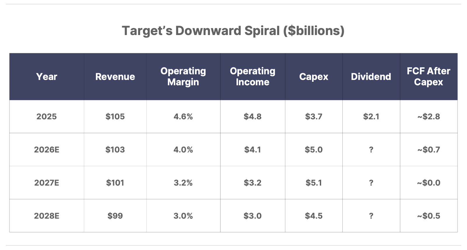The real problem is traffic. A stressed consumer pulls back on discretionary baskets and trades down to true discounters. Lower prices – required to drive traffic – and a focus on essentials shave gross margins, while fixed store and labor costs remain. Operating margins collapse.